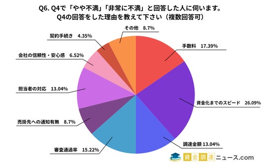 満足度が低かった理由として、最も多く挙げられたのは「資金化までのスピード(26.09%)」でした。これに続き、「手数料(17.39%)」が不満点として挙げられています。