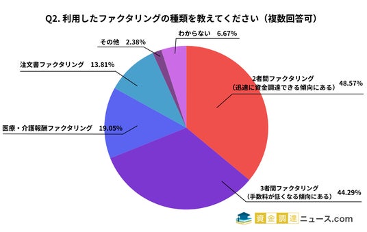 利用したファクタリングの種類について、最も多かったのは「2者間ファクタリング(48.57%)」でした。この結果から、資金調達までの速さや、売掛先へ通知することなく資金調達することが可能などのメリットが評価されていることがわかります。