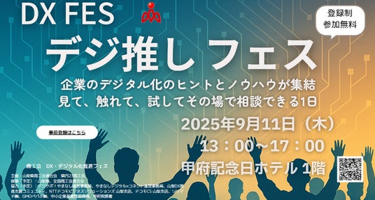 このたび、山梨県商工会連合会では、県内23商工会及び関係団体と連携してあらゆる業種の中小・小規模事業者が、最新のデジタルツールやその活用事例を“その場で見て、触れて、相談できる”体験型イベント「デジ推しフェス2025」が、2025年9月11日(木)に甲府記念日ホテルで開催いたします。