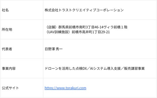 株式会社トラストクリエイティブコーポレーション(本社:群馬県前橋市、代表取締役:日野澤秀一)は、デルタ電子株式会社(日本本社:東京都港区、代表取締役社長:華健豪)が開発したAIによるインフラ点検支援システム「SKYINSPECT AI」の日本総代理店として全国に向けて販売講習店(二次代理店)の募集を開始いたしました。
