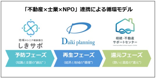 この独自のビジネスモデルを支えるのが、3つの組織の連携体制です。大希企画では、不動産再生・リノベーション事業を軸に、士業ネットワーク「士希の会」、およびNPO法人「相続・不動産サポートセンター」と連携。「相続」から「再生・活用」までを一貫支援する体制を構築しています。