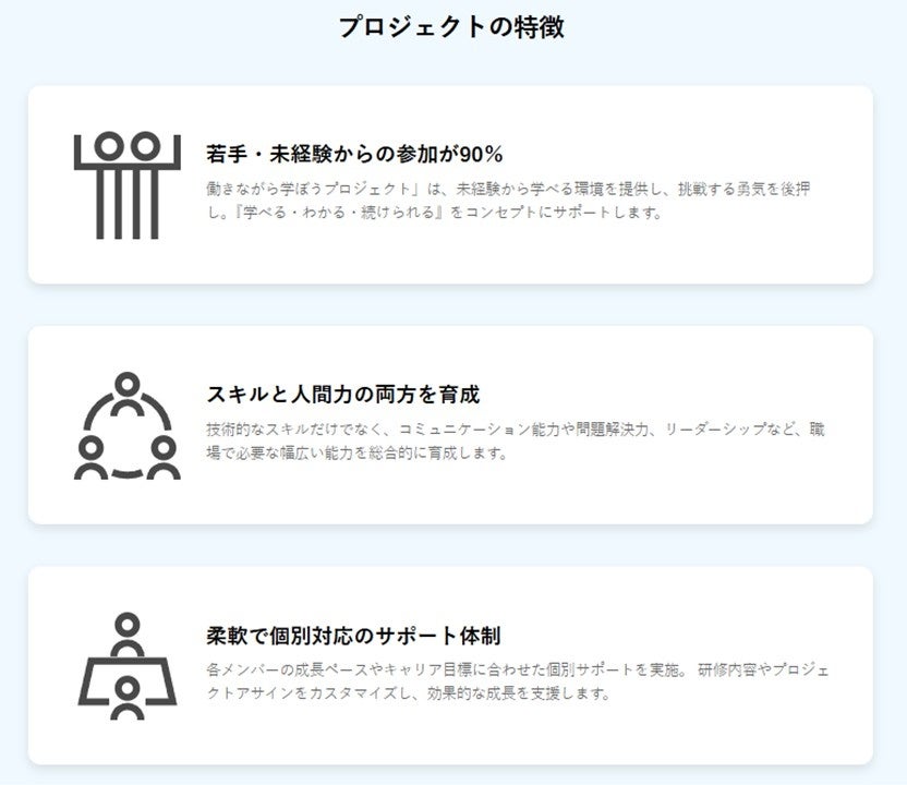 当プロジェクトでは、技術と合わせて「人間力」も育てる研修を取り入れ、総合的な成長をサポートします。