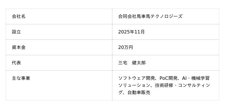 合同会社馬車馬テクノロジーズ(代表:三宅健太郎)は、ソフトウェア開発および生成AI導入支援を主軸とするテクノロジーカンパニーとして設立されたことをお知らせいたします。