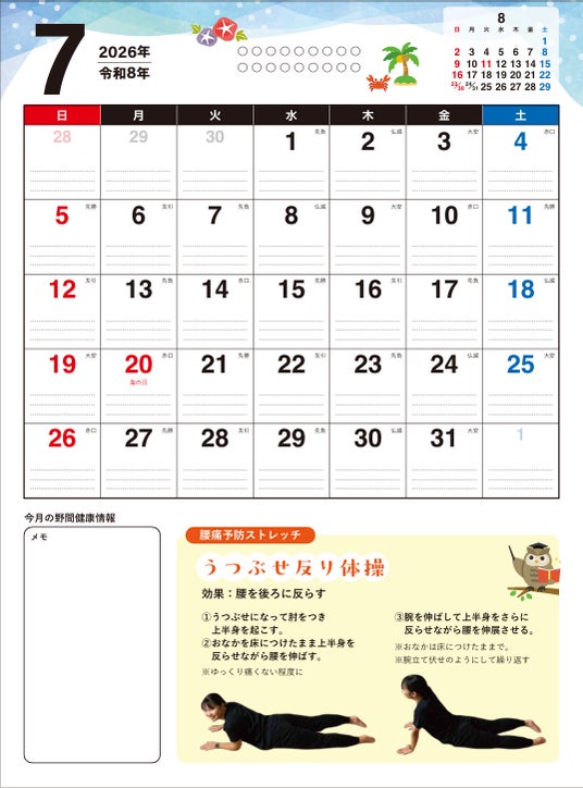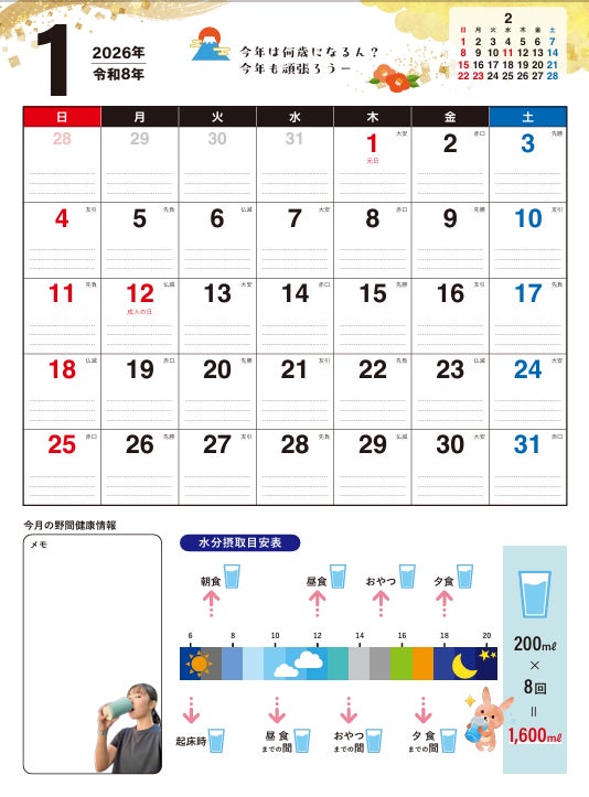 家庭の中で日常的に目にするカレンダーという形を取ることで、健康づくりを「特別なもの」ではなく、日々の生活の一部として自然に意識できる仕掛けとしています。