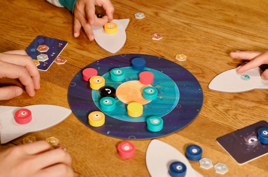 ルールは「ロケットからコマを指で弾く」だけ。カーリングやおはじきに似た直感的な操作のため、お子さまから大人まで、すぐに一緒に遊ぶことができます。しかし、コマをどこに配置するかという戦略性は奥深く、ボードゲーム愛好家も唸らせる仕上がりです。また、言語も必要ないため外国の方もすぐに楽しむことができます。