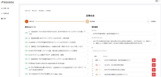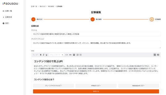 ”SOUSOU”を利用することで、記事作成作業がAIによって自動化され、キーワードを指定するだけで高品質なSEO記事を生成することが可能です。