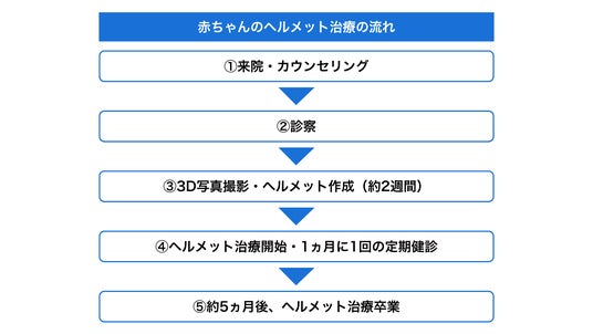 ・治療の流れ:頭部形状の3Dスキャンを行い、オーダーメイドのヘルメットを作成(約2週間)します。ヘルメットの使用方法や注意点を説明後1日23時間装着し、1ヵ月に1回3D画像の撮影と頭部、ヘルメットの状態を確認していきます。約5ヵ月後に治療終了です。