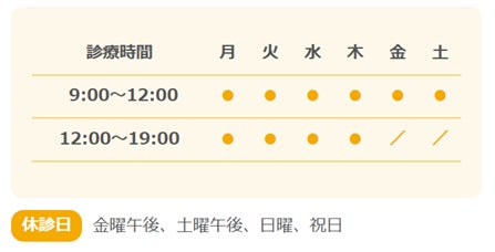 ・診療時間:9:00~12:00、12:00~19:00(休診日:金曜午後、土曜午後、日曜、祝日)