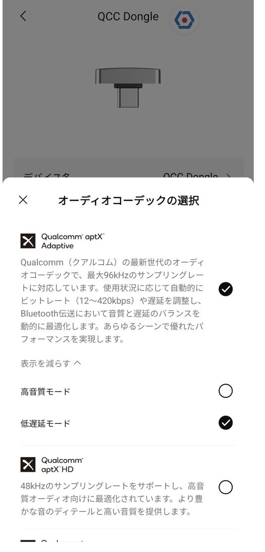 QCC Dongle Proは、今年2月の製品発表時の仕様から一部変更を行い、aptX Losslessに新たに対応いたしました。なお、初期ロットの取扱説明書にはaptX Losslessへの対応が記載されておりませんが、実際には対応しておりますのでご安心ください。