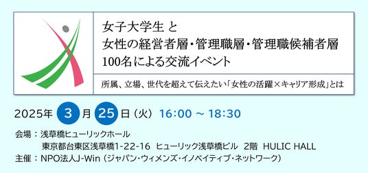 NPO法人J-Win(ジェイウイン、理事長:横尾敬介 東京都千代田区)は、会員企業に所属する女性の経営者層、管理職層、管理職候補者層と、女子大学生の有志の企画による交流イベントを開催することになりました。