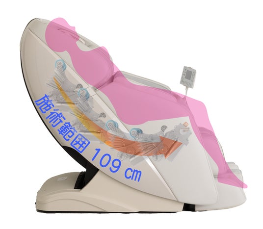 もみメカの施術範囲が約109cmとなり、当社従来製品※と比較して約165%UP。もみメカによる施術範囲をお尻まで延伸させることにより、多裂筋や大臀筋をマッサージすることで、引き締まったヒップラインを保つ助けになります。