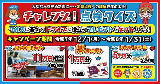 近畿地区自動車整備連絡協議会(代表:大阪市住之江区南港東3-5-6、会長:城谷忠)は、近畿地区2府4県の自動車ユーザーを対象に、”クルマの定期点検の重要性”をわかりやすく啓蒙することを目的とした、”大切な人を守るために...クルマの定期点検への理解を深めよう!「チャレンジ!点検Quizキャンペーン」”の第2弾を、2025年12月1日(月)~2026年1月31日(土)の期間で開催いたします。