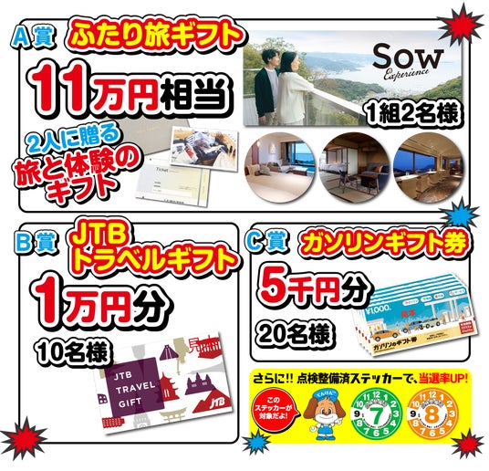 同内容にて9月~10月に実施したキャンペーンでは大変多くの反響をいただきましたため、第2弾も無事、実施に至ることができました。今回も、「点検整備済みダイヤルステッカー」の添付で当選確率UPとなります。大切な人と一緒に車での旅行をお楽しみいただきたいという思いを込めた本キャンペーンは、第1弾にご応募いただいた方でも応募が可能です。ぜひ、この機会にキャンペーンにご参加いただき、来年の冬も”安心・安全な”カーライフをお楽しみいただければ幸いです。第二弾もご応募をお待ちしております。