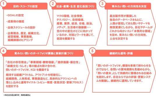 「社会・産業・技術・生活・行動様式に関する未来の変化仮説」と「自社の理念・事業領域を進化・深化させる問い」、「人類が長い歴史の中で紡いできた文明と文化に関する問い」を横断的に結びつけます。自社ならではの「育成したい問い」を体系的に設計・構築します。