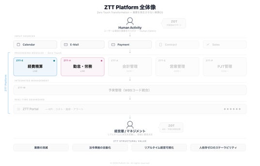 ZTT-Eに続きZTT-Hが加わったことで、ZTT Platform全体像の輪郭が少しずつ見えてきています。ZTTが目指すのは、経費精算や勤怠管理といった個別の業務効率化ではありません。バックオフィス業務自体が「そもそも発生しない」世界です。