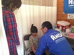アムダ(http://amda.or.jp/)は国連経済社会理事会「総合協議資格」NGOです。多国籍医師団を結成し、自然災害、戦争の避難民などに対して、医療を中心とした支援活動を行っています。熊本地震の発生を受け4月15日に被災地益城町に入り情報収集を行い、17日に益城町の広安小学校で診療を開始しました。ガラス破片や釘を踏んでしまった患者さんなどの治療にあたっています。また、大人や子どもにも便秘の症状や、雨の影響から風邪をひいた被災者の診療を続けています。