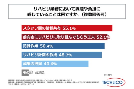 次に、リハビリ業務に課題や負担を感じている(少し感じている、感じている、大いに感じている)と回答した人を対象に「リハビリ業務において課題や負担に感じていること」を尋ねる設問への回答では、1位が「スタッフ間の情報共有」で55.1%、2位が「前向きにリハビリに取り組んでもらう工夫」で52.1%、3位が「記録作業」で50.4%という結果になりました。また、4位以降も回答率40%を超える回答が複数並ぶことから、リハビリ業務において課題や負担に感じていることは、多岐にわたることがわかりました。