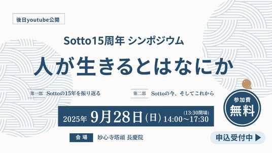 認定NPO法人 京都自死・自殺相談センター Sotto(代表:生越照幸、所在地:京都市下京区)は、設立15周年を記念してシンポジウム「人が生きるとは何か」を2025年9月28日(日)、京都市右京区の長慶院にて開催いたします。