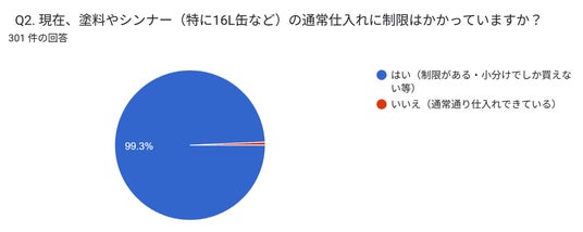 「現在、塗料やシンナー(16L缶など)の通常仕入れに制限はかかっているか?」という問いに対し、全体の99.3%が「はい(制限がある・小分けでしか買えない等)」と回答。一部地域の「目詰まり」ではなく、日本全国を覆う構造的かつ致命的な供給ストップが起きていることが証明されました。