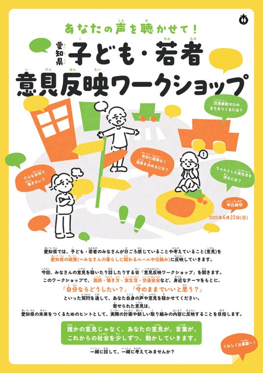 具体的には、こども・若者を集めたワークショップを開催し、県の施策に対して意見を聴き、愛知県の施策に子ども・若者の声を反映する取り組みを推進していきます。