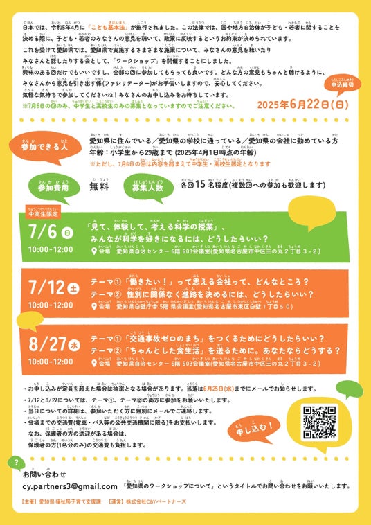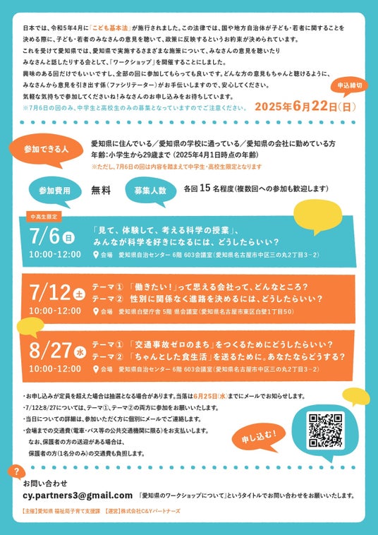 株式会社C&Yパートナーズ(代表取締役:土肥潤也)は、令和7年度から愛知県が取り組む「子どもの意見反映推進業務」を受託しました。この事業は、こども基本法第 11 条にて、こども施策に対する子どもの意見反映の取組が義務付けられていることを背景に、愛知県においても子ども・若者の意見反映の取組を推進する業務です。
