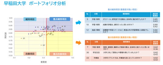 NPS(R)が最も高かった早稲田大学についてポートフォリオ分析をしたところ、全体的に満足度が高いことがわかりました。学生支援分野や学生生活分野、卒業後分野では弱みである重点改善項目が多いものの、学習・教育分野においては重点維持項目が集中しており、それらが同大学の強みであることが示されています。