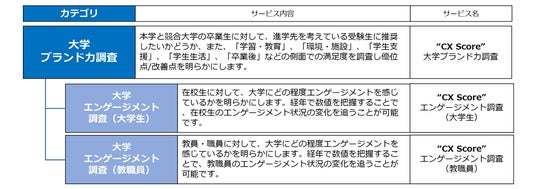 当社グループでは、本調査を通じて得られた分析手法と示唆をもとに、大学向けブランド評価支援サービス「大学“CX Score”」の提供を開始し、大学向けに販売してまいります。このサービスは、大学におけるブランド強化、卒業生ロイヤルティ把握、広報戦略の見直し、寄附促進、学生支援体制の改善といった複数の分野で活用いただけます。