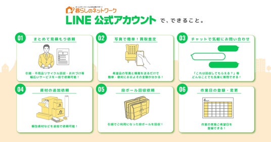 引越や不用品の回収、お片づけ等の見積もり依頼から、段ボール回収・資材の追加手配・お問い合わせまで、暮らしの「困った」をLINE上で簡単にご依頼いただけます。