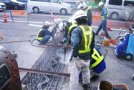 伸縮装置の取替工事では、コンクリートブレーカーなどを使用するため騒音が大きい。振動の発生や粉じんの飛散、大型の重機を使用するため排気ガスによる環境負荷も大きい