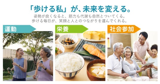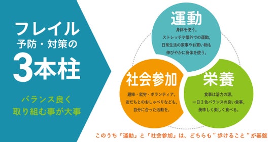 フレイル予防には「栄養・運動・社会参加」の3要素が必要ですが、「運動」と「社会参加」はいずれも「歩けること」が前提条件となります。