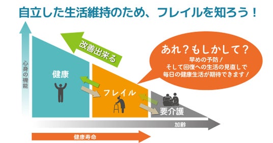 フレイル(虚弱状態)とは、健康と要介護の間にある状態で、適切な対策により健康状態への回復が可能です。