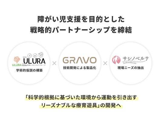 株式会社GRAVO (本社:茨城県つくば市、代表取締役:長福紳太郎)は、このたび一般社団法人ULURA(所在地:茨城県つくば市、 代表理事:澤江幸則、博士(教育学)、筑波大学体育系 准教授)および株式会社サシノベルテ(本社:茨城県石岡市、代表取締役:久保田嘉郎)と、障がい児支援を目的とした戦略的パートナーシップを締結します。