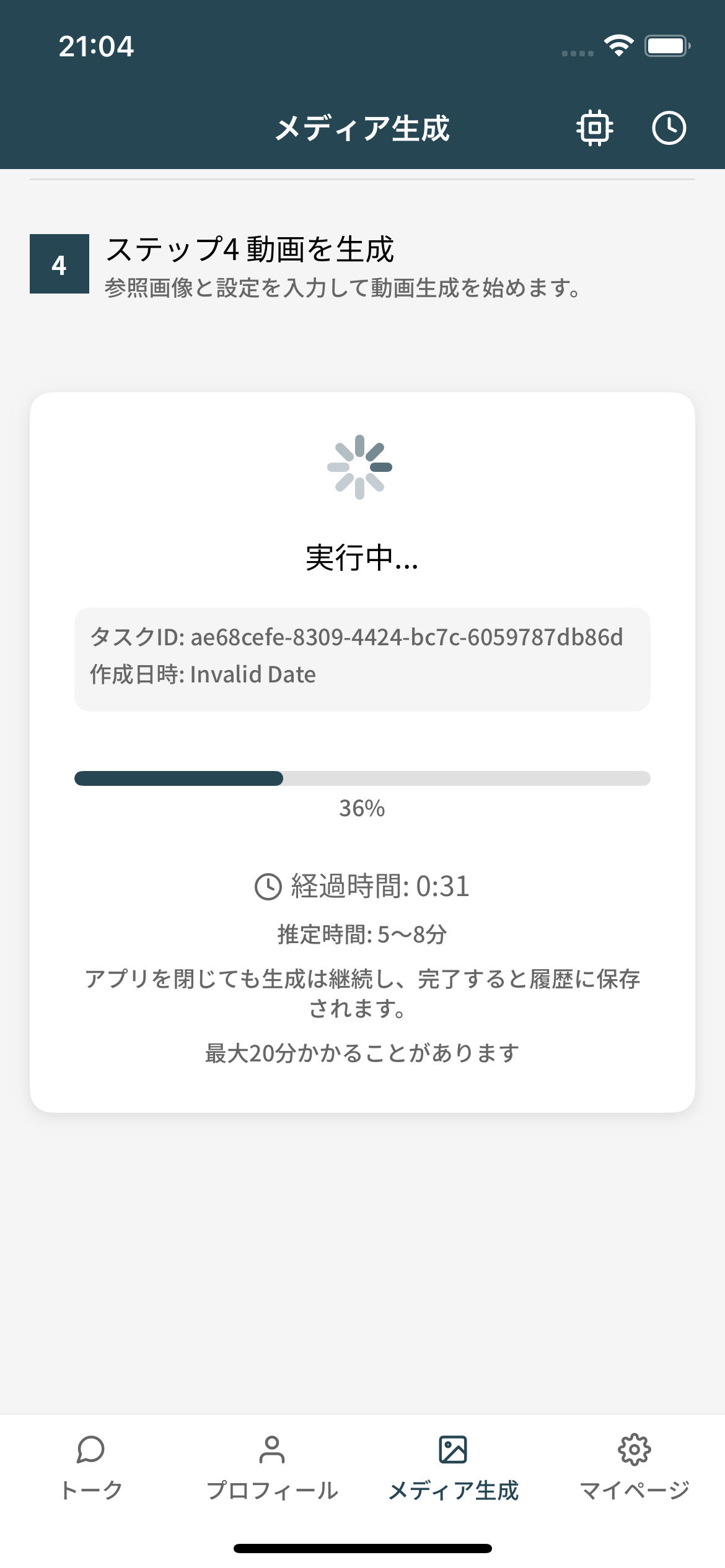 アプリ内のメディア生成画面に表示される「動画生成」ボタンからご利用ください。