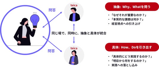 本プログラムは、組織の実行力を左右する「抽象と具体の翻訳力」をミドル層が体得することを目的としています。最大の特徴は、1名のミドル層に対してteicaの2名が同時に対話する「1対2」という形式です。一人は抽象(Why/What)を、一人は具体(How/Do)を担当し、同じ場で両方の視点からの問答が交わることで、抽象と具体を往復する思考習慣を、頭で理解するだけでなく身体知としての定着をはかります。