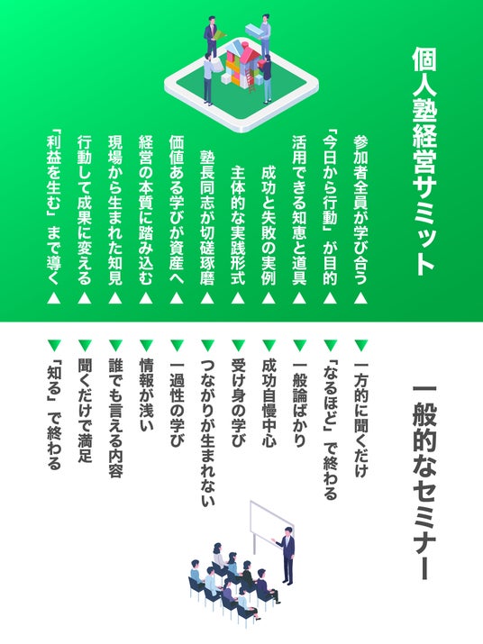 「個人塾経営サミット」は、一方的に情報を伝えるだけの「セミナー」ではありません。