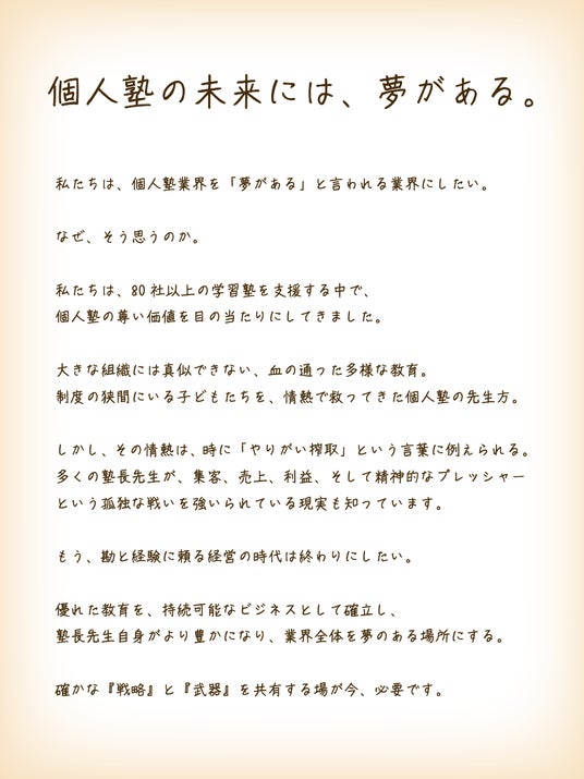 私たち「個人塾経営サミット」が提供するのは、あなたの塾で今日から使える『本物の実践力』だけです。