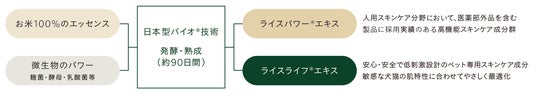 勇心酒造独自の醸造発酵技術と最先端の科学を掛け合わせた「日本型バイオ(R)」技術から生まれた「ライスパワーエキス」の研究知見を参考に、新たにペット専用として開発された米由来発酵成分です。国産米100%を原料に、麹菌・酵母・乳酸菌といった自然界の微生物の力を借りて、約90日間かけて発酵・熟成。犬猫の繊細な肌特性に配慮し、性質や役割の異なる3つの成分が、それぞれのケア目的に応じて設計・採用されています。