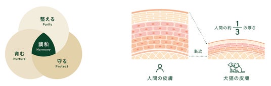 (左)ROCCANISTの3つのアプローチ:Purify/Nurture/Protect (右)人と犬猫の皮膚構造の違い(イメージ図)