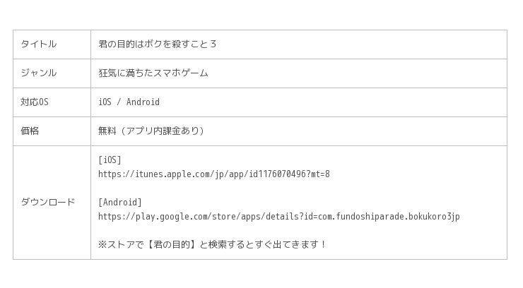 ふんどしパレード株式会社(本社:東京都国分寺市、代表取締役:北迫宏一郎・山田裕希)は、配信中のスマートフォン向け無料ゲーム『君の目的はボクを殺すこと3』で【(それなりに)大型アップデート】を実施いたしました。