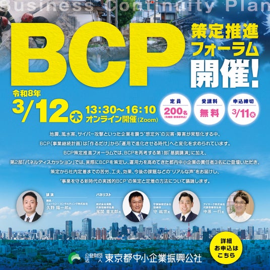 公益財団法人東京都中小企業振興公社は、令和7年度「BCP策定推進フォーラム」を開催し、第1部では、時代の変化に対してBCPはどうあるべきかを再考する「基調講演」を行います。