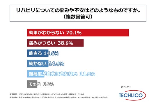 次に、リハビリを受けている際、悩みや不安があったと回答した人を対象に「リハビリについての悩みや不安はどのようなものか」を尋ねる設問への回答では、1位が「効果がわからない」で70.1%、2位が「痛みがつらい」で38.9%、3位が同率で「飽きる」と「続かない」で14.6%という結果になりました。この結果から、リハビリについての悩みや不安で最も多いのは、「効果がわからないこと」であることがわかりました。