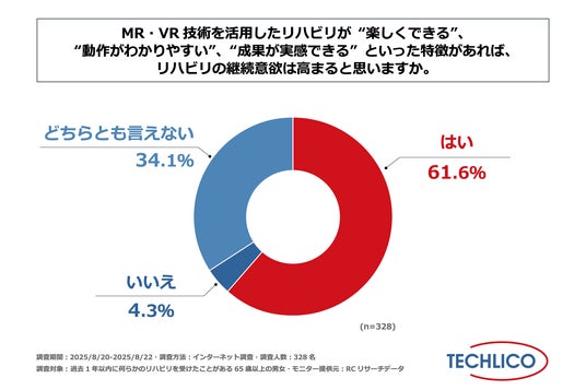 調査の最後、「MR・VR技術を活用したリハビリが“楽しくできる”、“動作がわかりやすい”、“成果が実感できる”といった特徴があれば、リハビリの継続意欲は高まると思うか」を尋ねる設問への回答では、1位が「はい」で61.6%、2位が「どちらとも言えない」で34.1%、3位が「いいえ」で4.3%という結果になりました。この結果から、過去1年以内にリハビリを受けた高齢者の6割以上が、MR・VR技術を活用したリハビリが、“楽しくできる”、“動作がわかりやすい”、“成果が実感できる”、といった特徴があれば、リハビリの継続意欲は高まると考えていることが明らかになりました。