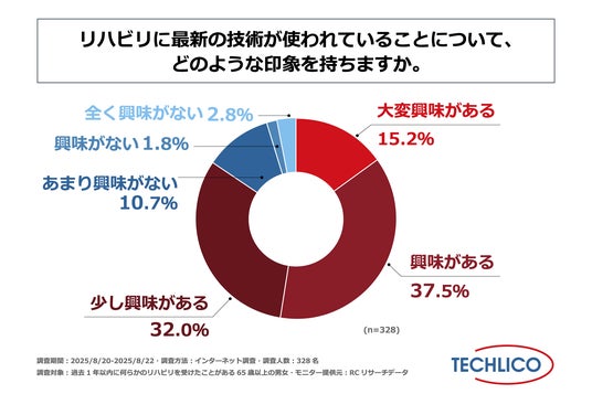 続いて、「リハビリに最新の技術が使われることについて、どのような印象を持つか」を尋ねる設問への回答では、1位が「興味がある」で37.5%、2位が「少し興味がある」で32.0%、3位が「大変興味がある」で15.2%という結果になりました。1位から3位の回答を合計すると回答率約85%となり、この結果から、過去1年以内にリハビリを受けた高齢者の約85%が、リハビリに最新技術が使われることに少なからず興味があることが判明しました。