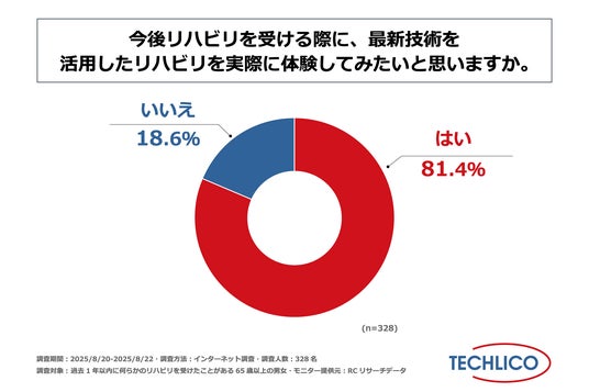 また、「今後リハビリを受ける際に、最新技術を活用したリハビリを実際に体験してみたいか」を尋ねる設問への回答では、「はい」が81.4%、「いいえ」が18.6%、という結果になりました。この結果から、過去1年以内にリハビリを受けた高齢者の8割以上が、今後リハビリを受ける際に、最新技術を活用したリハビリを実際に体験してみたいと考えていることが明らかになりました。