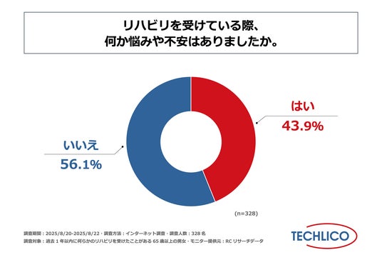 まず、「リハビリを受けている際、何か悩みや不安はあったか」を尋ねる設問への回答では、「いいえ」が56.1%、「はい」が43.9%という結果になりました。この結果から、過去1年以内にリハビリを受けた高齢者の4割以上が、リハビリを受けている際、何らかの悩みや不安を抱えていることが明らかになりました。