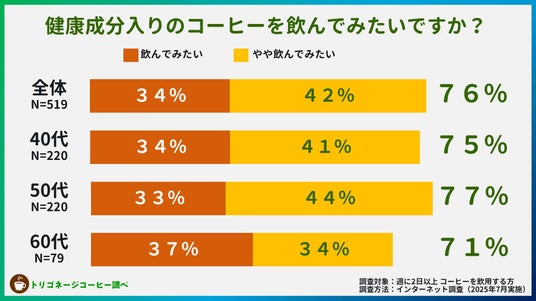 「健康成分入りコーヒーを飲んでみたい」と答えた人は全体で76%。40~60代までの全世代で7割超という高い関心を示し、ヘルスケアコーヒーへの強いニーズが浮き彫りになりました。