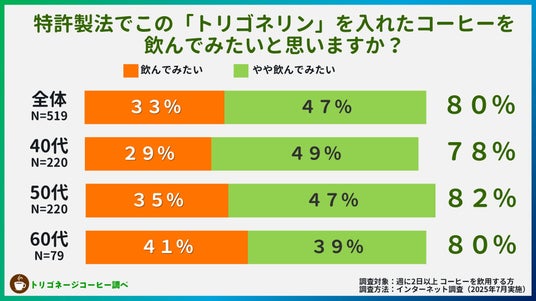 まだまだ知られていないトリゴネリンについて、成分を改めて説明したうえで飲用意向を聞いてみたところ、「飲んでみたい」と答えた人は一気に80%に跳ね上がりました。しかも、世代差なく高い数値を記録。この2% → 80% という劇的な変化が、コーヒー市場に眠る”爆発的潜在需要”の大きさを物語っています。