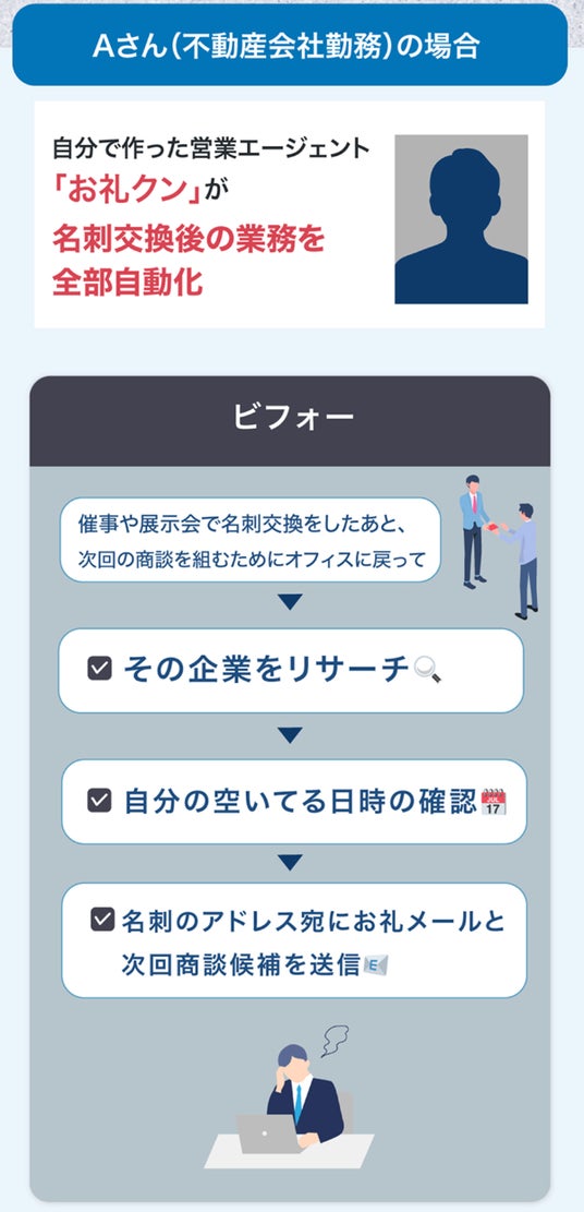 といったように、人から指示や入力をして初めて動く生成AIやAIエージェント(Difyや従来のAIエージェントと言われているもの)ではなく、日常の業務の中でAIが動くトリガー(上記、具体例の下線部)を設定しておくことで、勝手にAIが設定したフローを辿って業務を遂行してくれることが可能になります。