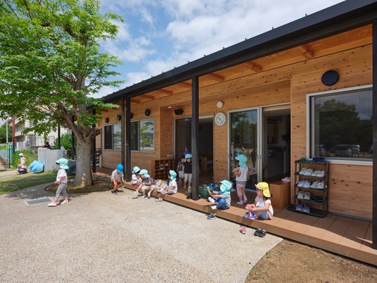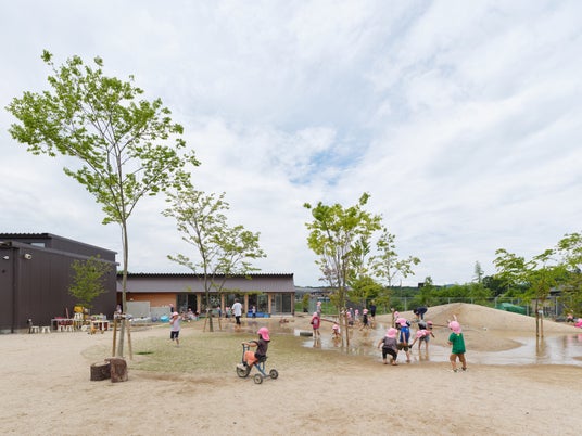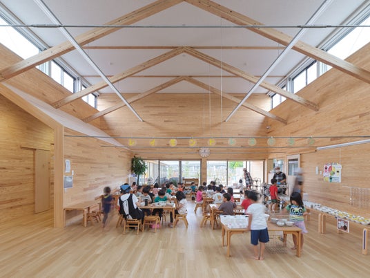滋賀県の田園地帯に開園した定員200名の大規模園。軽やかな家型の木架構が園舎を横断し、屋内広場と保育室、ホールを連続させます。屋外には運動用の広場、野菜や花を育てる広場を設け、室内には広場と小さな空間を点在。びわこ材の木質空間で子どもの居場所をつなぎ、主体性や多様性を受け止める環境をめざしました。
