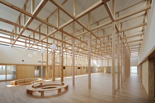 レイモンド斑鳩こども園は「経済産業大臣賞」を受賞。「地元産材の列柱を配したホールの空間的存在感は特筆に値する」と審査員が評価。